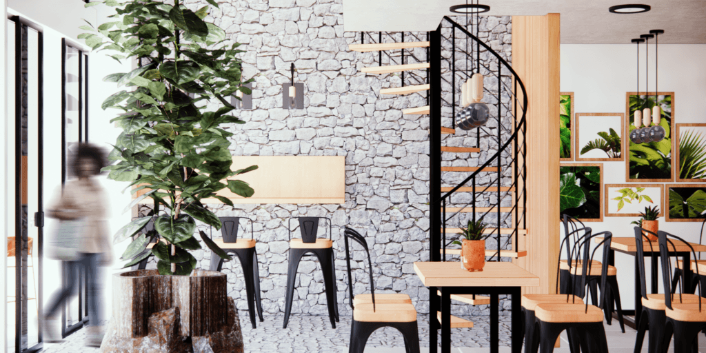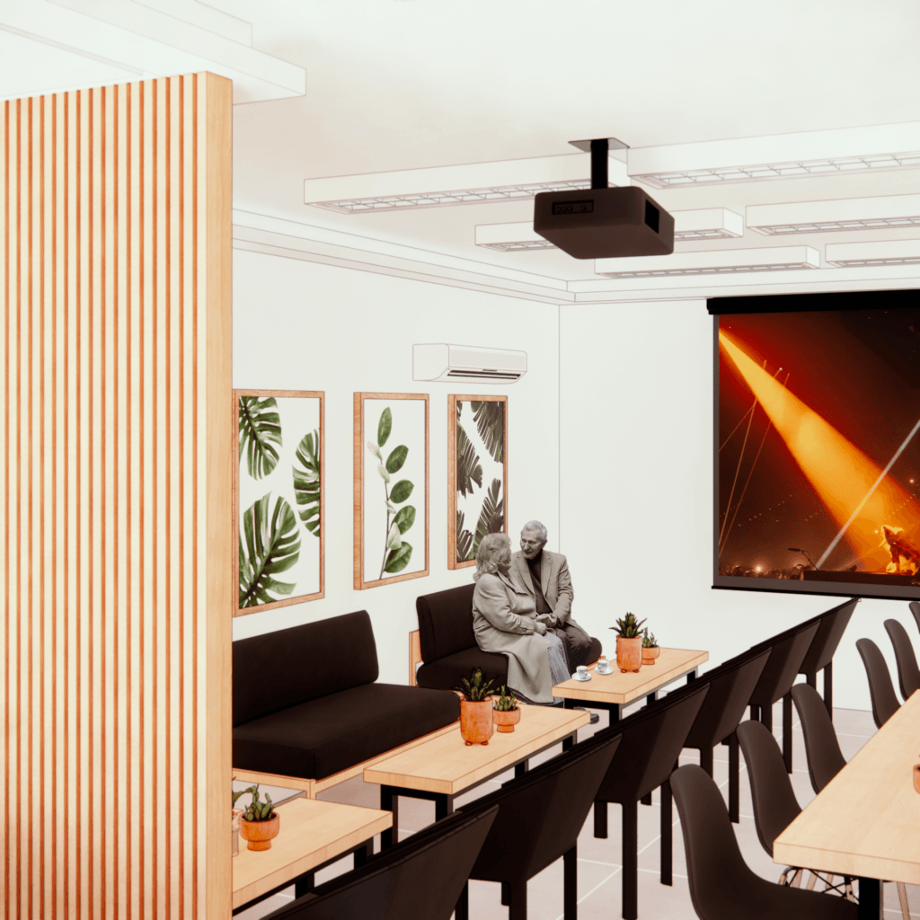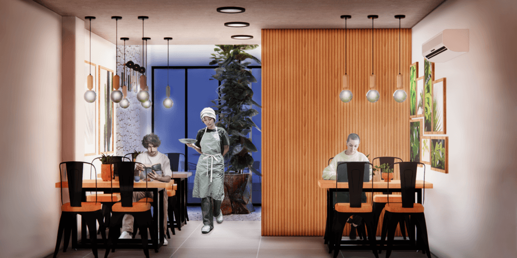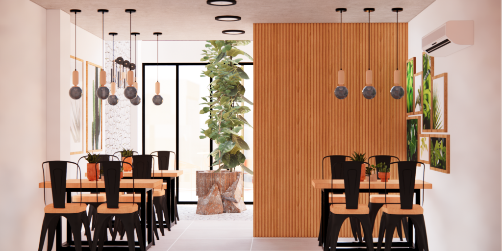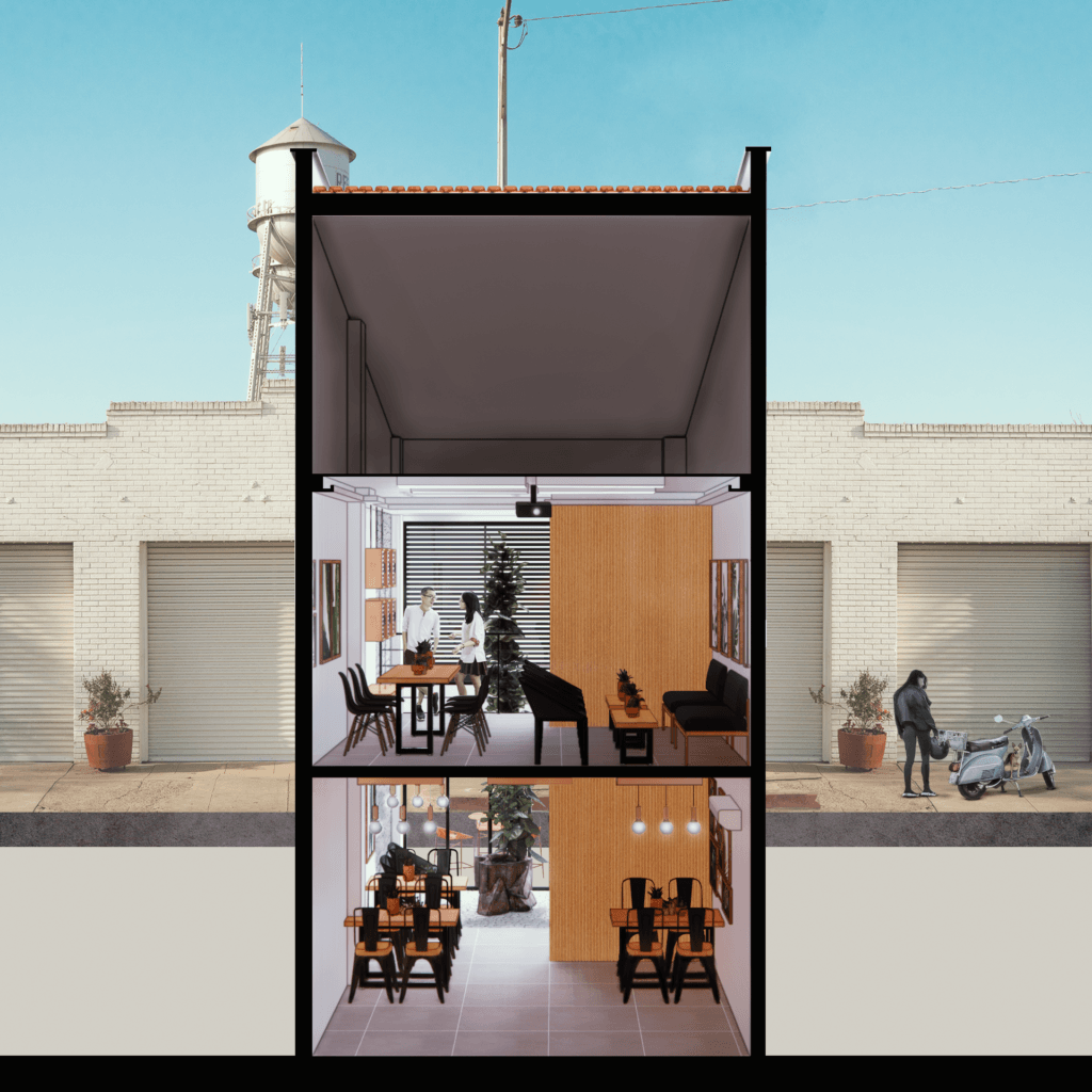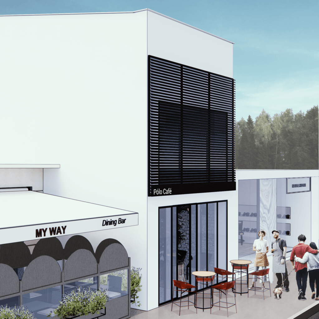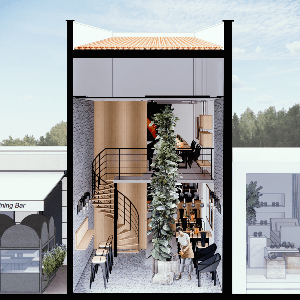 Projetado como um ponto de encontro aconchegante para trabalhadores da região industrial. Com dois pavimentos, organiza a cozinha nos fundos, a área de atendimento à frente e um espaço para confraternizações no superior. O projeto destaca a transição entre o exterior industrial e o interior acolhedor, com pé-direito duplo e materialidade rústica, dando protagonismo ao mobiliário e paisagismo em um ambiente neutro.