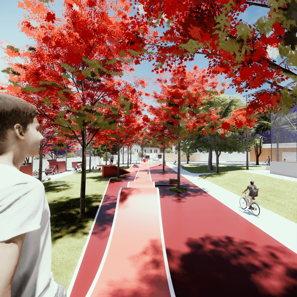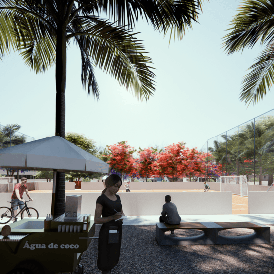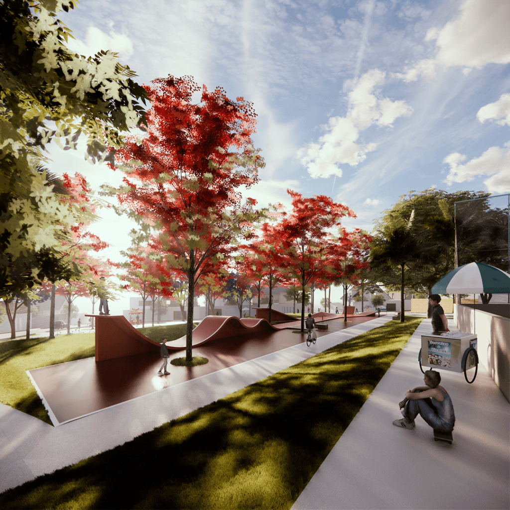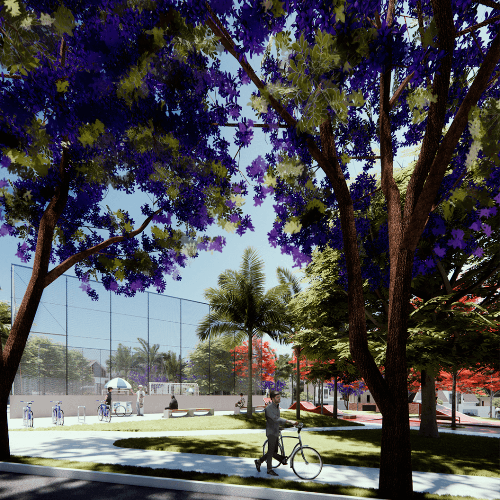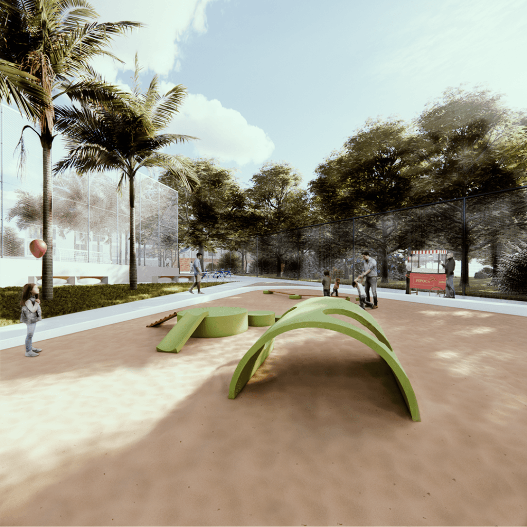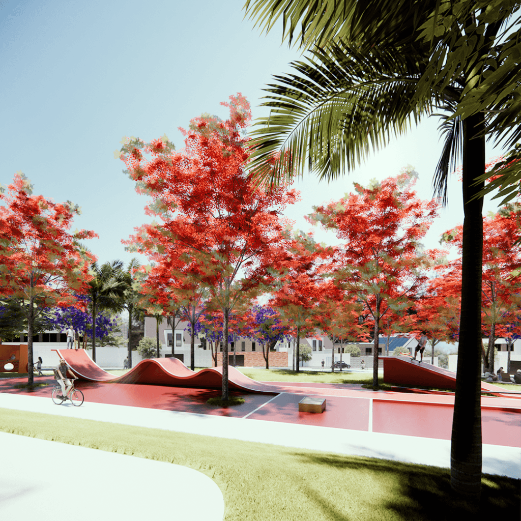 Praça das Árvores foi projetada para ser um ponto de encontro e lazer para os moradores de um novo loteamento em uma cidade de Goiás. Oferece diversas opções, como playground, quadra de futebol, academia ao ar livre e área para food trucks, com destaque para a pista de skate. A escolha da localização visou atender aos moradores e valorizar o bairro, priorizando a topografia natural e a incidência solar, além de vegetação que proporcione sombra.